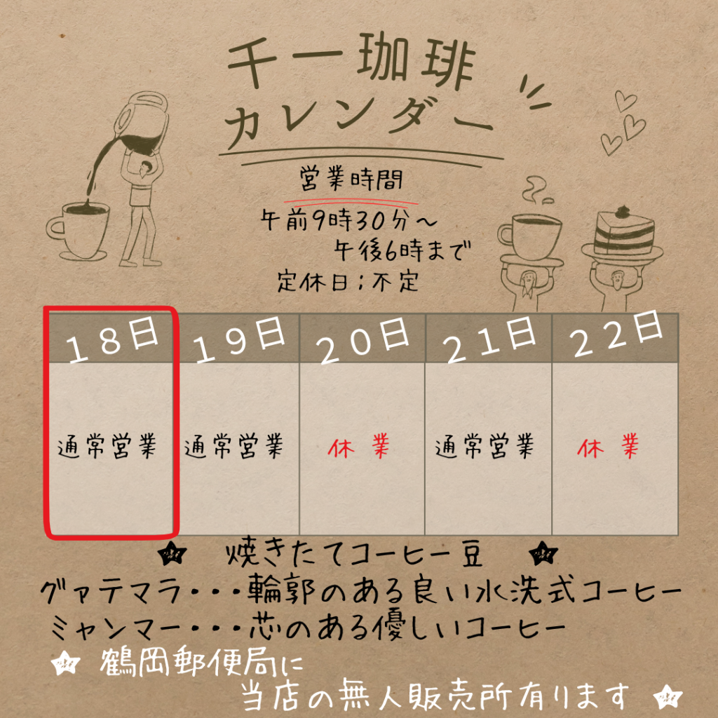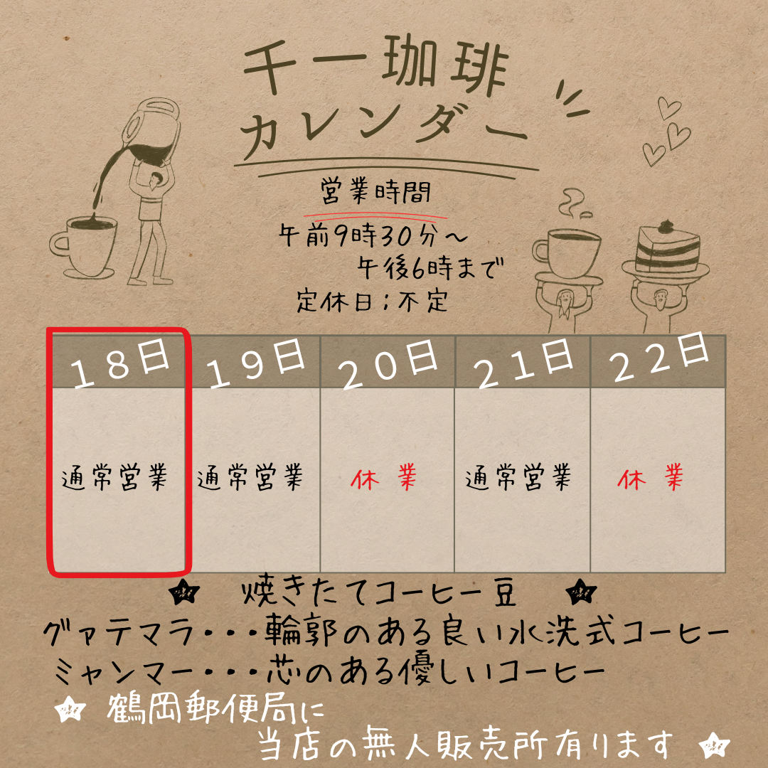 2025年7月18日 7/18(金) 本日も夕方6時まで営業 おはようございます! 本日も夕方6時まで営業しています。 今日の焼きたてコーヒーは、グアテマラとミャンマーです! 特にミャンマーのコーヒーは、最近多くのお客様からご好評いただいています。品種由来のジューシーさとアジアの気候が融合した、心のある柔らかさが特徴で、非常に心地よい飲み応えなんですよ。 この機会にぜひお試しください。皆さんのご来店を心よりお待ちしています! 岡部千信 千一珈琲の店主