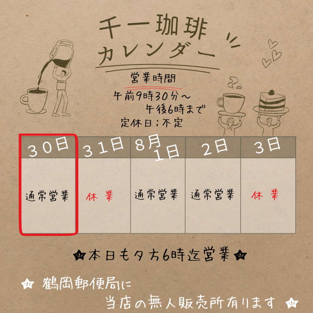 2025年7月30日 7/30(水)本日も〜18時営業です! 7/30(水)おはようございます!本日も〜18時営業です!今は新豆入荷の季節!千一珈琲、新しい豆を続々仕入れ中ですよ😊9月後半にはエチオピア、11月にはコロンビアが登場予定です!厳しい相場の中、皆さんに最高の豆をお届けできるよう頑張ります! 岡部千信 千一珈琲の店主