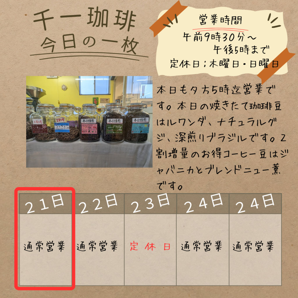 2025年11月21日 今日の焼きたて👇ルワンダ、グジ、深煎りブラジル☕️✨ お得な2割増量は、ジャバニカとブレンドニュー薫です! おはようございます! 本日も夕方5時まで営業しています。 今日の焼きたて珈琲豆は、人気の3種類です! ルワンダナチュラルグジ深煎りブラジル さらに、お得な2割増量コーヒー豆として、 ジャバニカブレンド ニュー薫 をご用意しています。 ぜひこの機会をお見逃しなく! 岡部千信 千一珈琲の店主