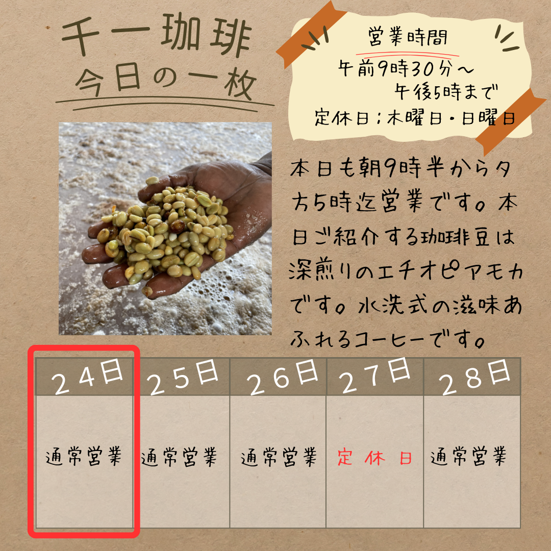 2025年11月24日 ☀️ 本日、11/24(月)も9:30〜17:00営業です! おはようございます! 本日も9時半から夕方5時まで営業しています。 本日ご紹介するコーヒーは、エチオピアの水洗式(ウォッシュト)モカです。 エチオピアのモカは様々な品種がありますが、全て在来種です。中でも、今回ご紹介する水洗式モカは、1974年に選抜された品種を主に使用している、いわゆる**「74系」**と呼ばれるコーヒー豆になります。 飲んだ瞬間に、ブルーベリーのような香りがふと立ちのぼる、非常にクリーンで良い水洗式モカです。ぜひこのクリーンな味わいをご賞味ください。 岡部千信 千一珈琲の店主