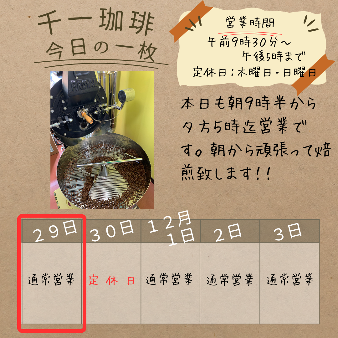 2025年11月29日 ☀️ 本日、12/1(月)も9:30〜17:00営業です! 寒い朝ですが、本日も朝から頑張って焙煎します🔥 おはようございます! 本日も朝9時半から夕方5時まで営業しています。 寒い朝ですが、温かいコーヒーをご用意できるよう、本日も朝から気合を入れて焙煎いたします! ぜひ、焼きたての美味しいコーヒー豆を探しにお立ち寄りください! 岡部千信 千一珈琲の店主