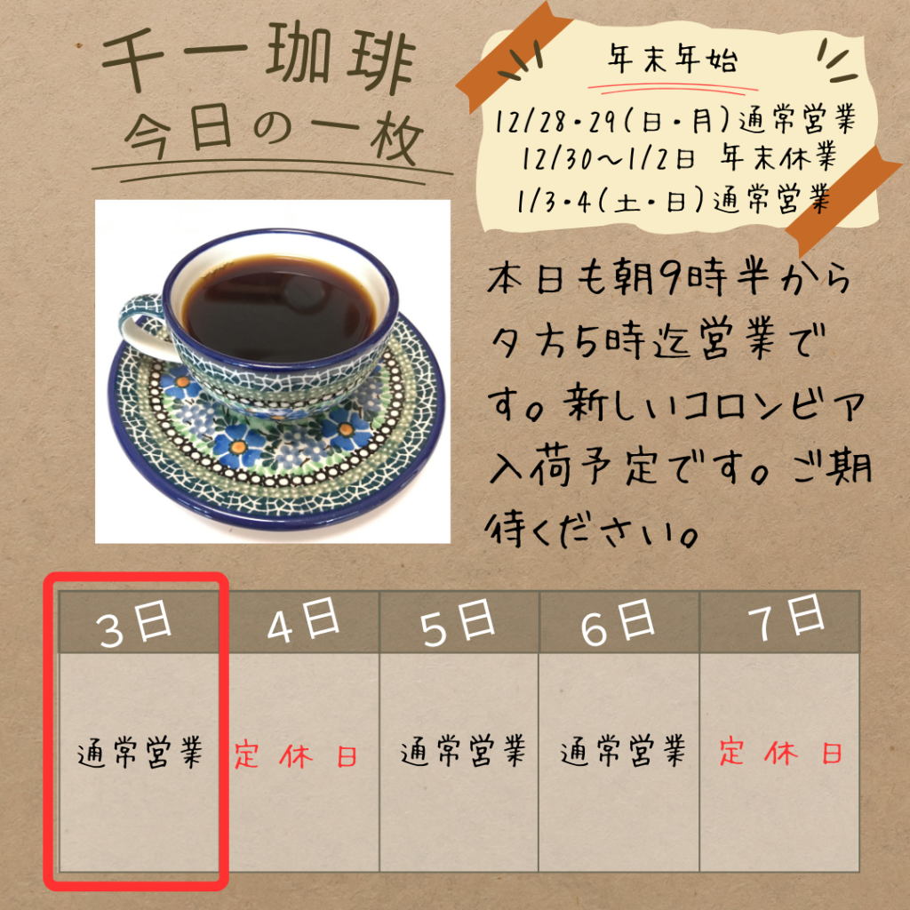2025年12月3日 ☀️ 本日、12/3(水)も9:30〜17:00営業です! おはようございます! 本日も朝9時半から夕方5時まで営業しています。 昨日は臨時休業をいただき、ご不便をおかけいたしました。本日は通常通り営業しておりますので、ぜひご来店ください。 【新豆入荷予定のお知らせ】 新しいコロンビアが入荷する予定です。 コロンビアファンの方、どうぞご期待ください! 岡部千信 千一珈琲の店主