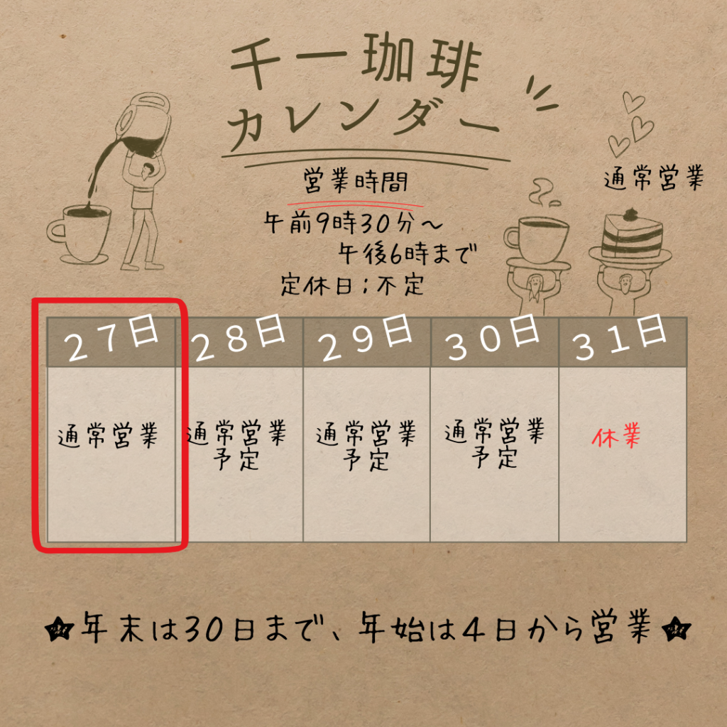 2024年12月27日 2024年12月27日(金)、本日も千一珈琲は夕方6時まで営業 おはようございます🌞!2024年12月27日(金)、本日も千一珈琲は夕方6時まで営業しております☕️✨。 🎍 千一珈琲の年末年始営業日程 🎍 12月30日(月)まで営業年始は1月4日(木)から営業開始 年末年始のおいしいコーヒーのお供に、ぜひお立ち寄りください😊! 岡部千信 千一珈琲の店主