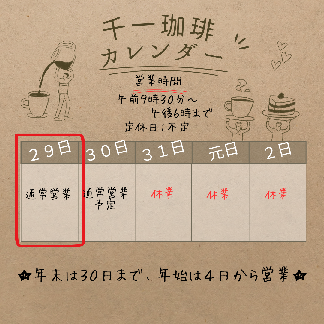 2024年12月29日 2024年12月29日(日曜日)、本日も千一珈琲は夕方6時まで営業 おはようございます🌞!2024年12月29日(日曜日)、本日も千一珈琲は夕方6時まで営業しております☕️✨。 🎍 年内の営業は明日30日(月)まで 🎍年末のコーヒー豆の準備、まだ間に合います!おいしいコーヒーで新年を迎えませんか😊? ぜひお立ち寄りください! 岡部千信 千一珈琲の店主