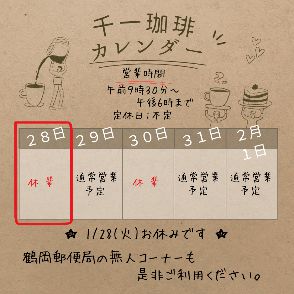 2025年1月28日 2025/1/28(火) 本日はお休みです 🛑 お知らせこんにちは!本日、千一珈琲はお休みを頂戴しております☕️💤。 📍 鶴岡郵便局の無人販売コーナーにてコーヒー豆をご購入いただけますので、ぜひご利用ください😊。 岡部千信 千一珈琲の店主