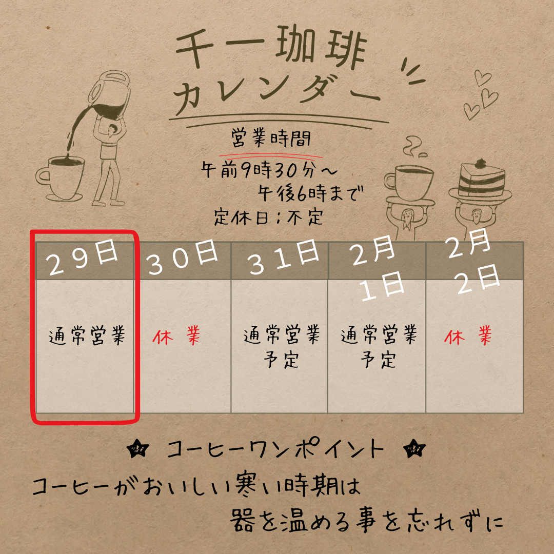 2025年1月29日 2025/1/29(水) 本日も夕方6時迄営業 🌟 こんにちは! 🌟千一珈琲は本日も夕方 6時まで営業 しております☕️✨。 ❄️ コーヒーワンポイント ❄️寒い季節、カップやサーバーなどの器を事前に温めることが重要!コーヒーが冷めにくく、香りや味わいがより引き立ちます✨。 さらに、コーヒーの温度で味の感じ方が変わるのもポイント☝️。 高めの温度:酸味が控えめで、苦みが強調されます。低めの温度:酸味がまろやかになり、甘みが引き立ちます。 ぜひ焙煎したての豆で、温度変化も楽しみながらお好みの味わいを見つけてください😊! 岡部千信 千一珈琲の店主