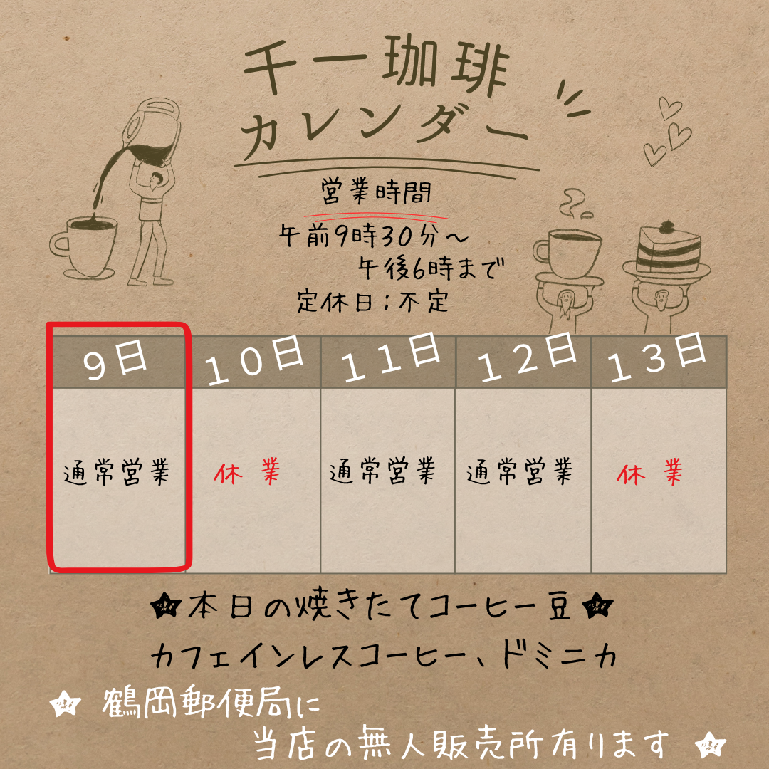 2025年7月9日 7/9(水)も夕方6時まで営業です! おはようございます!☀️本日、7/9(水)も夕方6時まで営業です!今日の焼きたてコーヒー☕️は、🇨🇴カフェインレス🇩🇴ドミニカドミニカはハニー製法🍯口当たり丸く、チェリー感も🍒ぜひ! 岡部千信 千一珈琲の店主