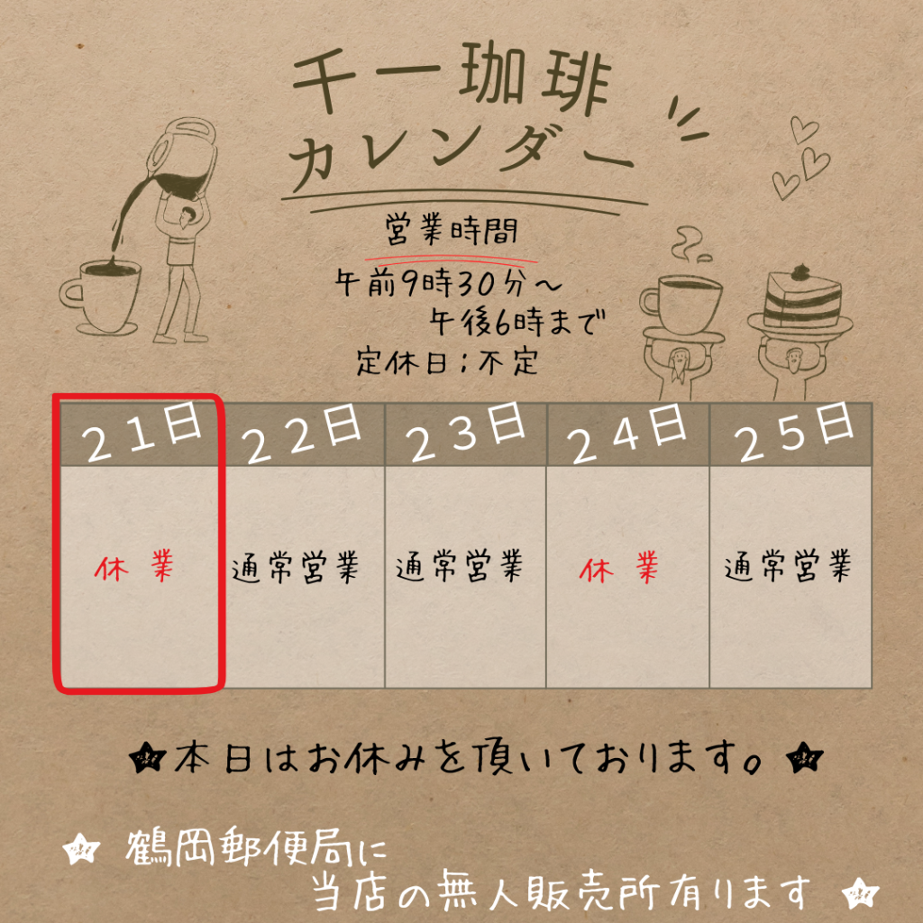 2025年8月21日 8月21日(木)はお休みをいただいております。 おはようございます! 千一珈琲です。本日、8月21日(木)はお休みをいただいております。ご不便をおかけしますが、どうぞよろしくお願いいたします。 明日、8月22日(金)は朝9時半から営業いたします。 岡部千信 千一珈琲の店主