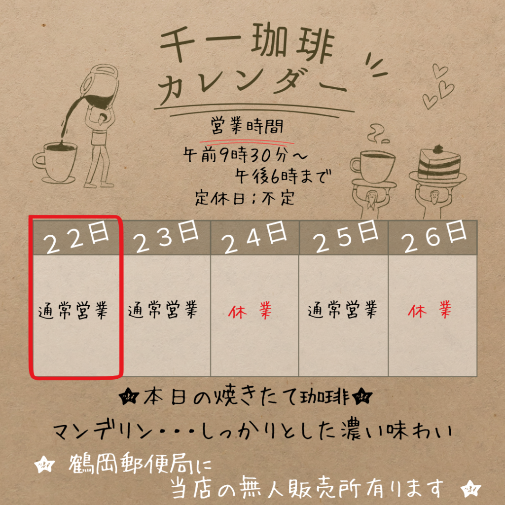 2025年8月22日 ☀️ 本日、8/22(金)も夕方6時まで営業です おはようございます!☀️ 本日、8/22(金)も夕方6時まで営業です! 今日の焼きたてはインドネシア マンデリン🇮🇩 スマトラ島産、独特の味わいは多くのファンに支持されています! ぜひお試しを☕️ 岡部千信 千一珈琲の店主