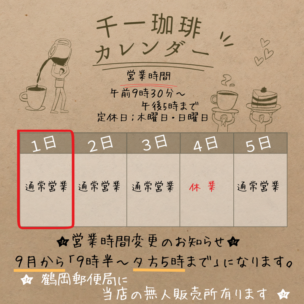 2025年9月1日 9/1(月)から新しい営業時間になります! 営業時間は**〜17時**、定休日は木・日曜です🗓️ おはようございます!☀️ 本日、9/1(月)から新しい営業時間になります! 営業時間は**〜17時**、定休日は木・日曜です🗓️ 本日もご来店お待ちしております! 岡部千信 千一珈琲の店主