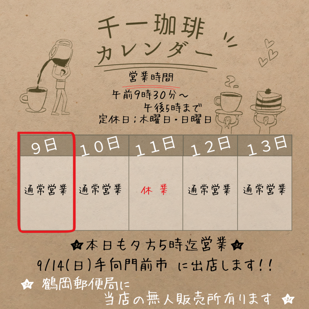 2025年9月9日 9/9(火) 本日も〜17時まで営業です! 9/9(火)おはようございます! 本日も〜17時まで営業です! 今週末9/14(日)は、羽黒山 手向門前市に出店します! ご来場お待ちしてます😊 #千一珈琲 #鶴岡市 #コーヒー豆専門店 #イベント情報 #羽黒山 岡部千信 千一珈琲の店主