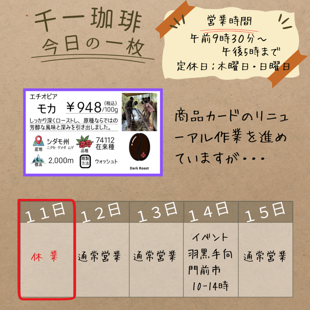 2025年9月11日 本日、9/11(木)はお休みをいただきます🙏 おはようございます!千一珈琲です☕️本日、9/11(木)はお休みをいただきます🙏商品カードのリニューアル作業中。AI全盛の時代ですが、手書きの温かみも大切にしたいなと…✍️難しいけどチャレンジしてみます! 岡部千信 千一珈琲の店主