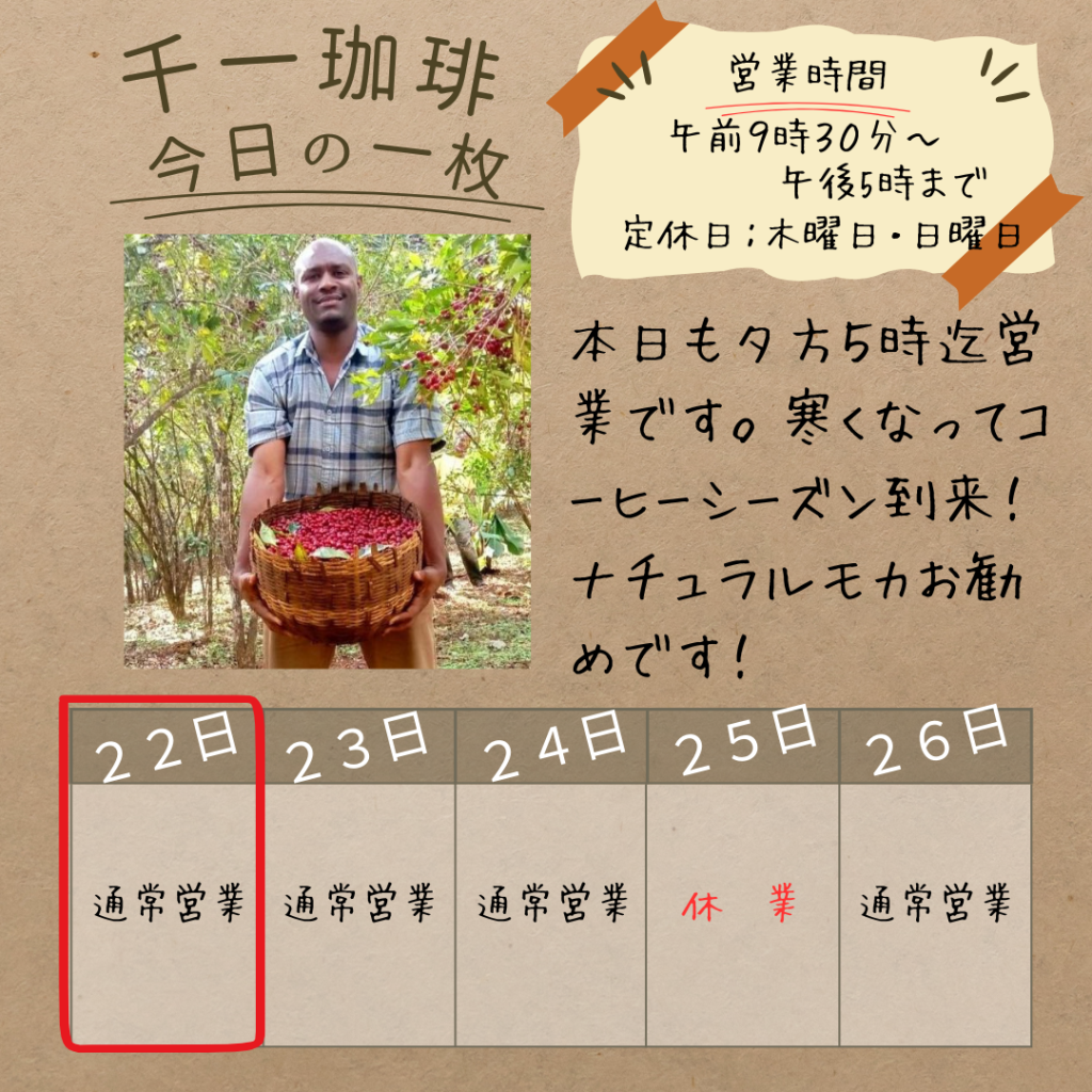 2025年9月22日 エチオピアの「ナチュラルモカ グジG3」が香り高くておすすめ☕️ 9/22(月)おはようございます!本日も〜17時営業です!寒くなってきた朝に、温かいコーヒーはいかがですか?エチオピアの「ナチュラルモカ グジG3」が香り高くておすすめですよ! 岡部千信 千一珈琲の店主