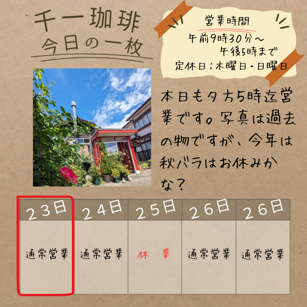 2025年9月23日 9/23(火)おはようございます! 本日も〜17時まで営業です!🍂 9/23(火)おはようございます!本日も〜17時まで営業です!今日の鶴岡は過ごしやすいですね🍂ご来店お待ちしております。 岡部千信 千一珈琲の店主