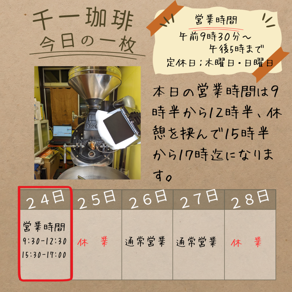 2025年9月24日 本日、営業時間を変更します🙇♂️ 午前: 9:30〜12:30 午後: 15:30〜17:00 おはようございます!本日、9/24(水)は都合により営業時間を変更します🙇♂️午前: 9:30〜12:30午後: 15:30〜17:00ご不便おかけしますが、よろしくお願いします。 岡部千信 千一珈琲の店主