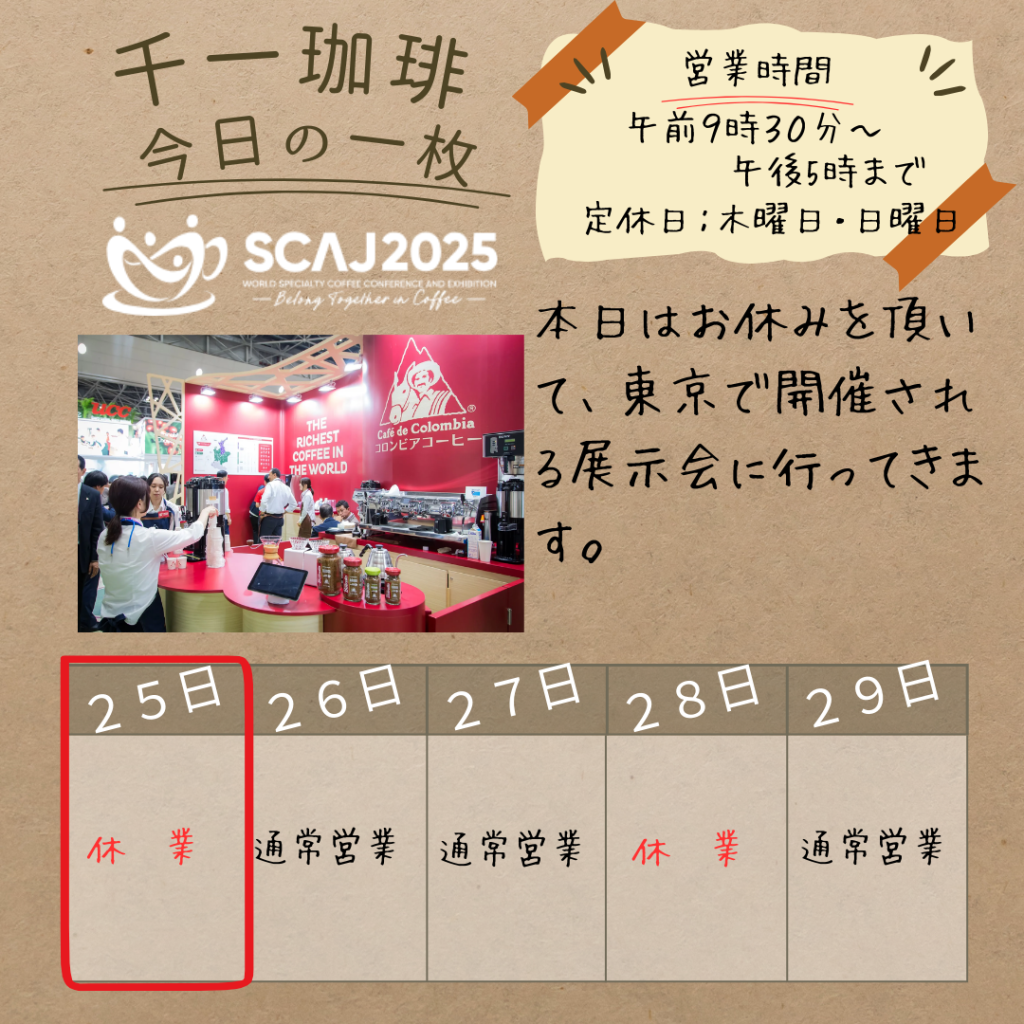 2025年9月25日 9月25日(木)はお休みをいただいております おはようございます! 千一珈琲です。本日、9月25日(木)はお休みをいただいております。ご不便をおかけしますが、どうぞよろしくお願いいたします。 今年はコーヒー業界にとって、まさに激動の年になりそうですね。ブラジルでの急騰を皮切りに、今後はさらに価格が上昇していくと予想されています。 そんな中、今日は展示会に参加してきます。各商社さんとじっくりお話をすることで、皆さんにベストなコーヒーを変わらず提供できるよう、しっかり情報をゲットしてきたいと思います! 岡部千信 千一珈琲の店主