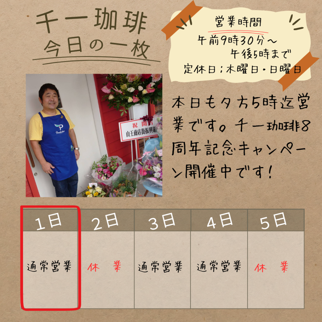 2025年10月1日 ㊗️8周年!キャンペーン開始🎉 おはようございます!☀️本日、10/1(水)も夕方5時まで営業です!【㊗️8周年!キャンペーン開始🎉】本日より10日まで!店頭で特典が選べます👇✅イタリアエスプレッソ✅豆2割増量✅1割値引きネットは豆2割増量!ぜひご来店ください✨ 岡部千信 千一珈琲の店主