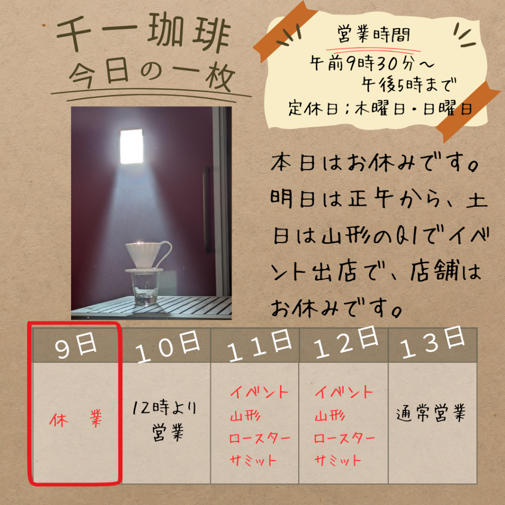 2025年10月9日 10月9日(木)はお休みをいただいております おはようございます! 千一珈琲です。本日、10月9日(木)はお休みをいただいております。ご不便をおかけしますが、どうぞよろしくお願いいたします。 【営業時間のお知らせ】 明日、10月10日(金)は正午12時からの営業となります。 【イベント出店のお知らせ!】 そして、今週末の10月11日(土)、12日(日)は、山形市のQ1で開催される「山形ロースターサミット」(@yamagata.roaster)に出店いたします! イベント会場でお待ちしておりますので、ぜひQ1まで足をお運びください。 岡部千信 千一珈琲の店主