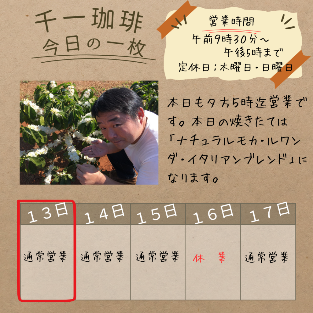 2025年10月13日 ☀️ 本日、10/13(月)も夕方5時まで営業です! おはようございます!☀️ 本日、10/13(月)も夕方5時まで営業です! 今日の焼きたては👇 ナチュラルモカ グジG3、イタリアンブレンド、ルワンダです☕️✨ 香り高いアフリカ豆もブレンドも勢揃い! #千一珈琲 #鶴岡 #本日営業 #焼きたてコーヒー #アフリカコーヒー 岡部千信 千一珈琲の店主