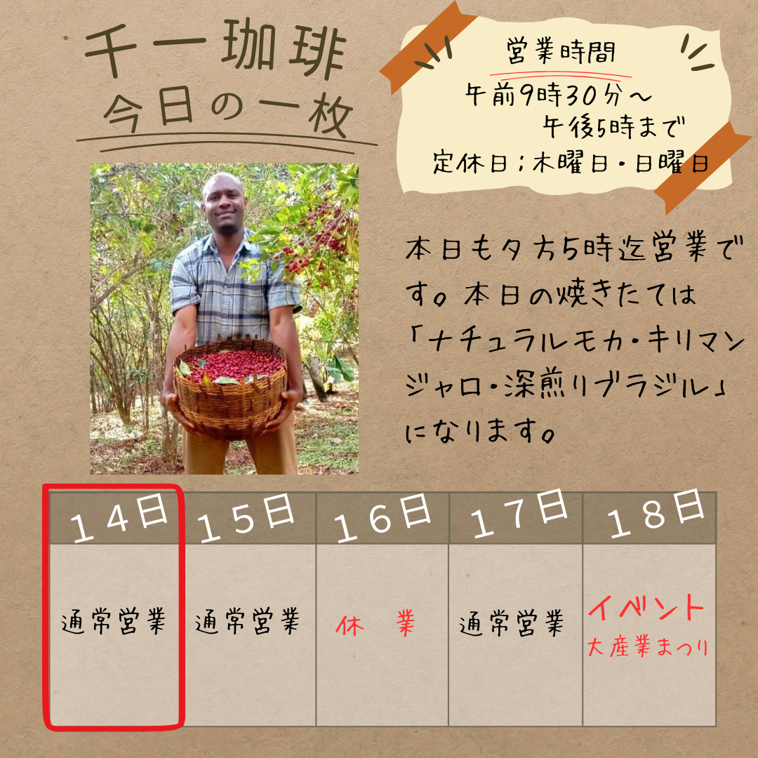 2025年10月14日 本日も夕方5時まで営業、今日の焼きたて珈琲豆は、人気の3種類です! おはようございます! 本日も夕方5時まで営業しています。 今日の焼きたて珈琲豆は、人気の3種類です! キリマンジャロ エチオピア ナチュラル グジG3 深煎り ブラジル 昨日早々に売り切れとなりましたエチオピア ナチュラル グジも、焼き立てをご用意できました!香り高い人気のアフリカ豆をぜひお楽しみください。 岡部千信 千一珈琲の店主