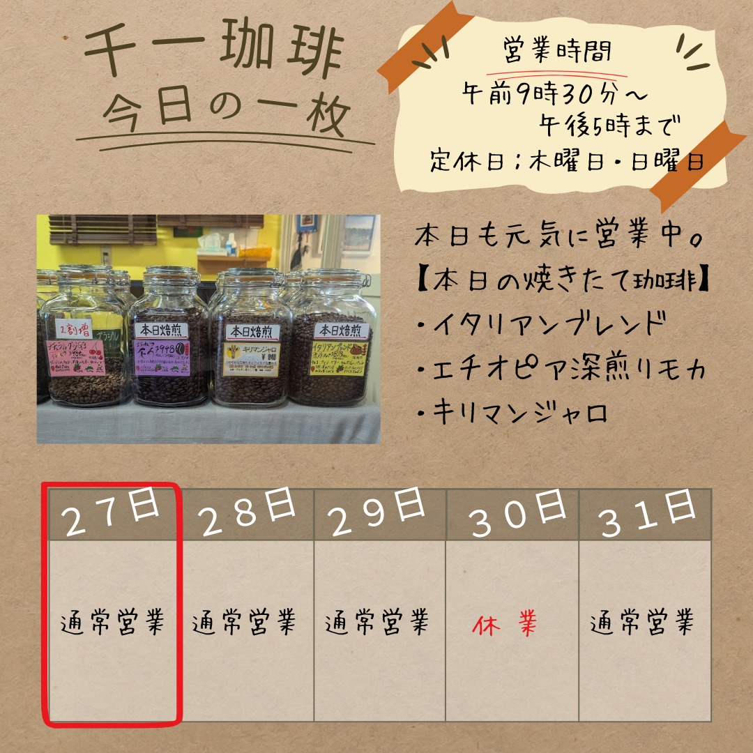 2025年10月27日 【今日の焼きたて珈琲豆】イタリアンブレンド・キリマン・モカ おはようございます! 本日も元気に営業中です。夕方5時まで皆さまのご来店をお待ちしております。 【今日の焼きたて珈琲豆】 イタリアンブレンドタンザニア キリマンジャロエチオピア 深煎りモカ 【お得な増量コーヒー】 エチオピア ナチュラル グジ この機会に、焼きたての定番ブレンドや、お得なグジのナチュラルなど、風味豊かなコーヒーをぜひどうぞ! 岡部千信 千一珈琲の店主