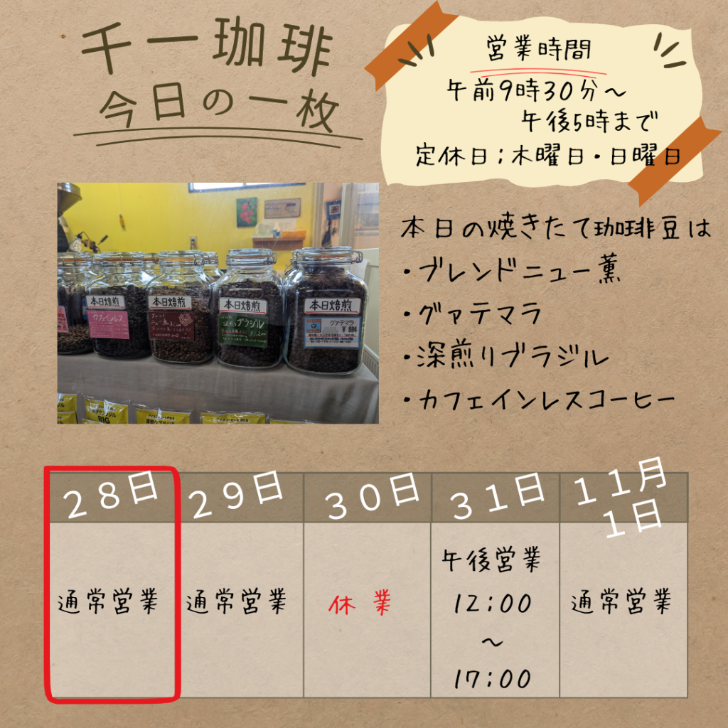2025年10月28日 焼きたて珈琲豆は、多様なラインナップをご用意しました! おはようございます! 本日も夕方5時まで営業しています。 今日の焼きたて珈琲豆は、多様なラインナップをご用意しました! カフェインレスコーヒーブレンド ニュー薫深煎り ブラジルグアテマラ 特にグアテマラは、標高2,000mという高地で育ったブルボン種を使用しています。風味豊かな一杯をぜひお試しください。 岡部千信 千一珈琲の店主