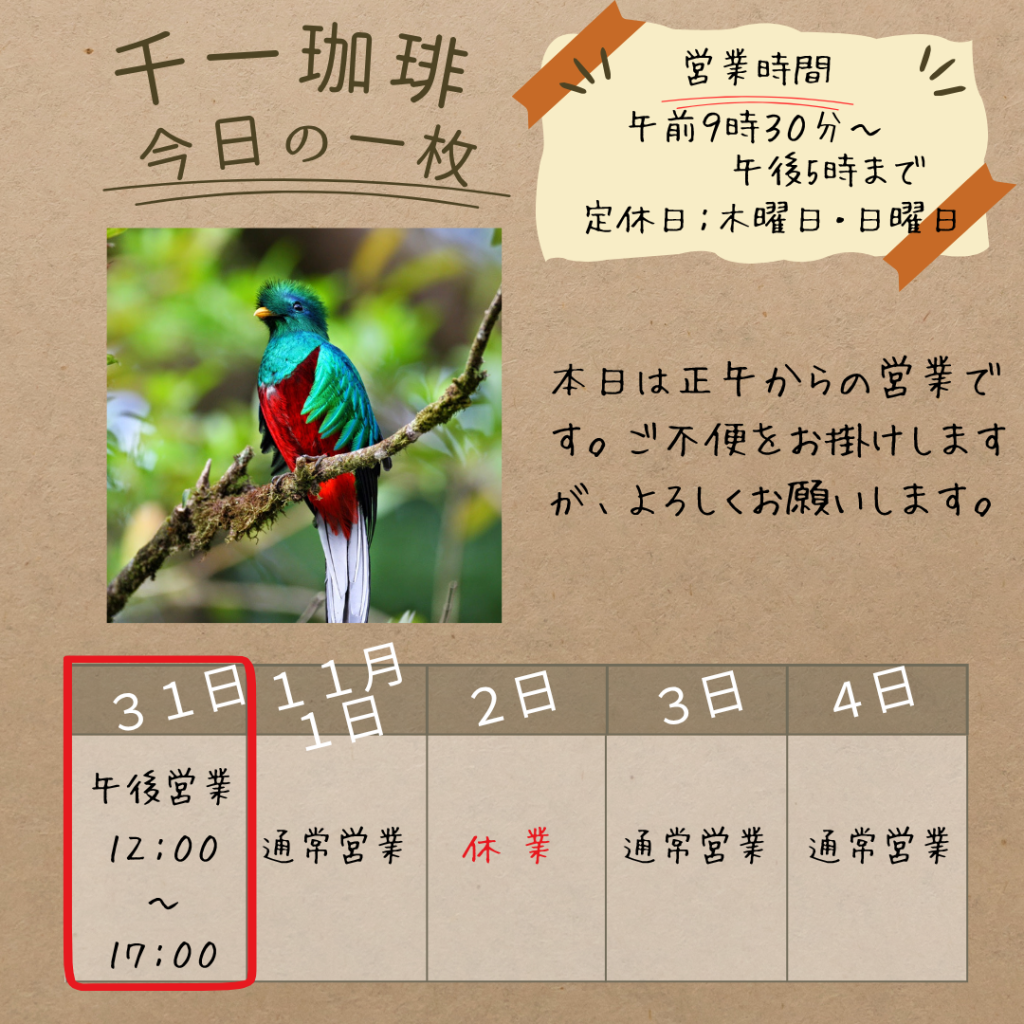 2025年10月31日 ☀️ 本日、10/31(金)は正午12時からの営業です☕️ おはようございます!☀️ 本日、10/31(金)は正午12時からの営業です☕️ ご不便をおかけしますが、よろしくお願いいたします。 #千一珈琲 #鶴岡 #営業時間変更 #お知らせ 岡部千信 千一珈琲の店主