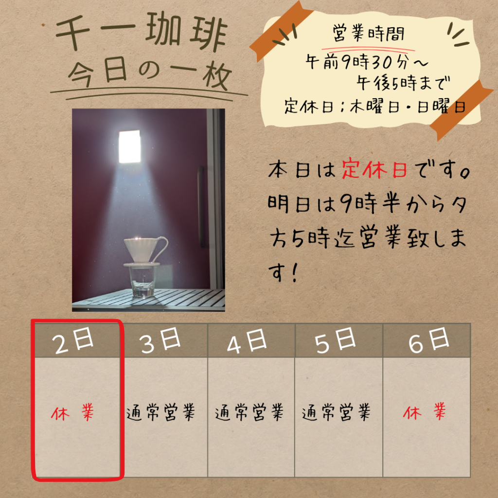 2025年11月2日 本日、11月2日(日)は定休日。 明日、11月3日(月)**(文化の日・祝日)**は、朝9時半から夕方5時まで営業いたします。 おはようございます! 千一珈琲です。本日、11月2日(日)は定休日をいただいております。ご不便をおかけしますが、どうぞよろしくお願いいたします。 【明日のお知らせ】 明日、11月3日(月)**(文化の日・祝日)**は、朝9時半から夕方5時まで営業いたします。 祝日も、新鮮で美味しいコーヒー豆をご用意して、皆様のご来店をお待ちしております! 岡部千信 千一珈琲の店主