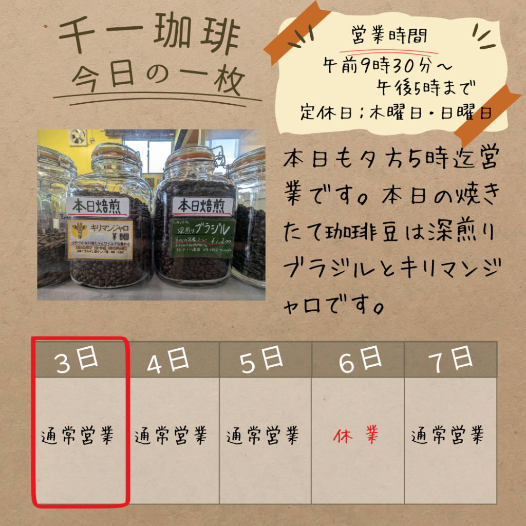 2025年11月3日 ただいま元気に営業中、今日の焼きたて珈琲豆は、人気の2種類です! ただいま元気に営業中です。本日も夕方5時まで営業しています。 今日の焼きたて珈琲豆は、人気の2種類です! 深煎りブラジルキリマンジャロ 特に深煎りブラジルは、ミナスジェライス州の「ダ・テーハ農園」が誇る、ナチュラル最上位のフルブルームを使用しています。昨年の干ばつによる不作の影響があったにもかかわらず、非常に香り高い出来栄え。さすが巨大農園の品質管理です。 ぜひ、このスペシャルなブラジルコーヒーをキリマンジャロと飲み比べてみてください! 岡部千信 千一珈琲の店主