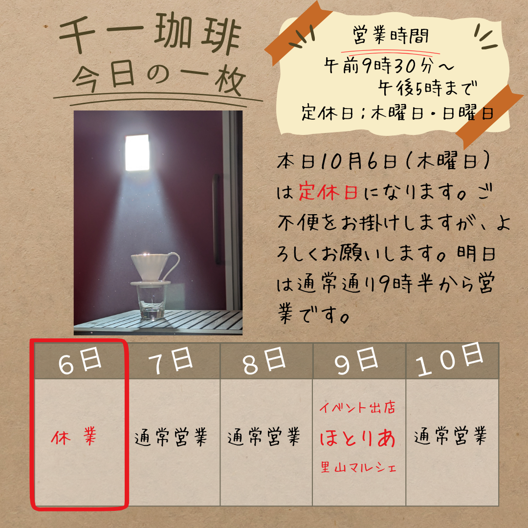 2025年11月6日 本日、11月6日(木)は定休日をいただいております。 おはようございます! 千一珈琲です。本日、11月6日(木)は定休日をいただいております。ご不便をおかけしますが、どうぞよろしくお願いいたします。 【明日のお知らせ】 明日、11月7日(金)は通常通り朝9時半から営業いたします。 岡部千信 千一珈琲の店主
