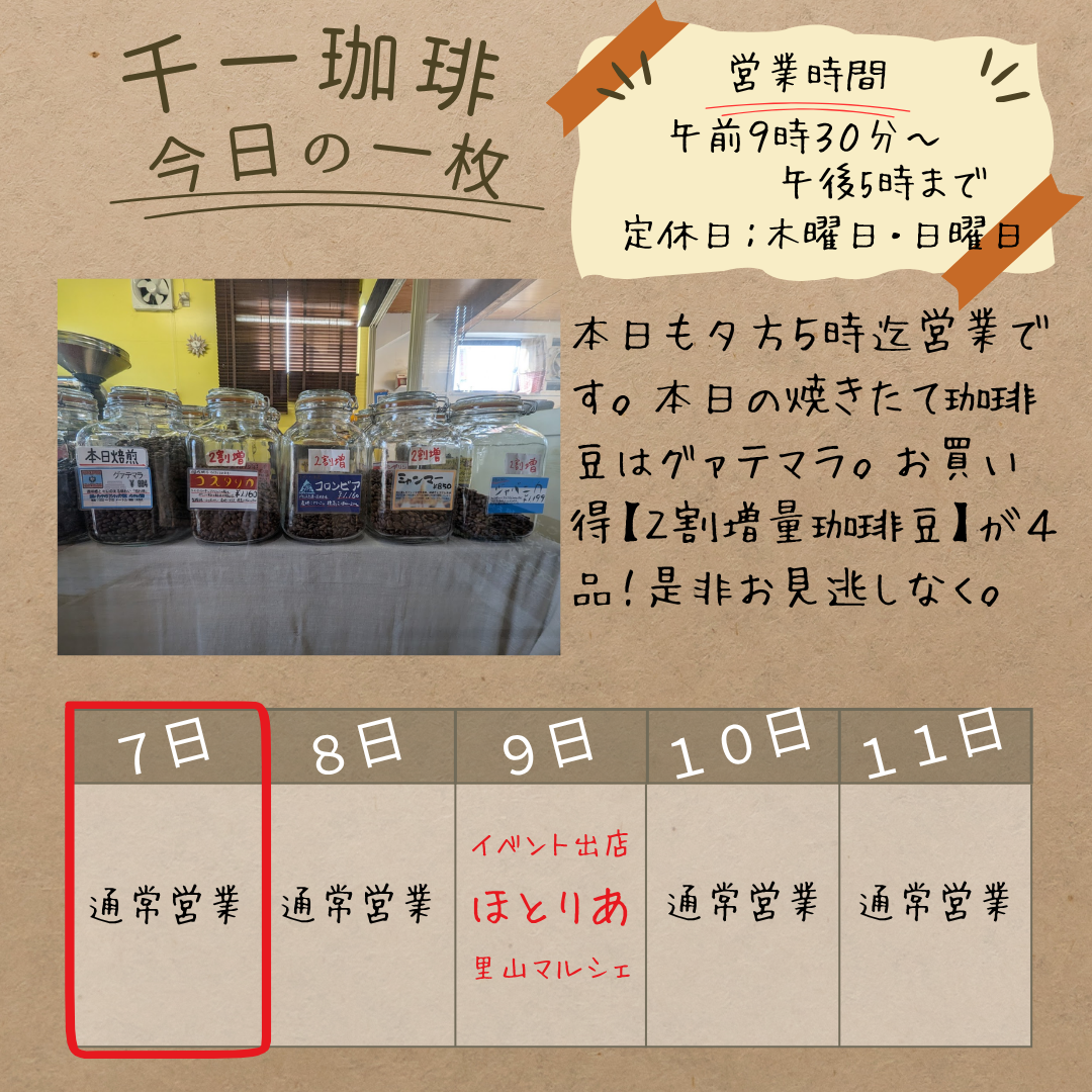 2025年11月7日 焼きたて珈琲豆は、ナッツ感あふれるグアテマラ!お買い得【2割増量コーヒー豆】が4品! おはようございます! 本日も夕方5時まで営業しています。 今日の焼きたて珈琲豆は、ナッツ感あふれるグアテマラです。 そして、お買い得【2割増量コーヒー豆】が4品ございます! ぜひこの機会をお見逃しなく! 岡部千信 千一珈琲の店主