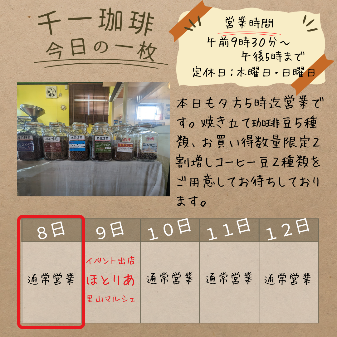 2025年11月8日 【今日のラインナップ】 今日は焼きたて珈琲豆を5種類、そしてお得な増量コーヒーを2種類ご用意してお待ちしております! おはようございます! 本日も夕方5時まで営業しています。 【今日のラインナップ】 今日は焼きたて珈琲豆を5種類、そしてお得な増量コーヒーを2種類ご用意してお待ちしております! ☕️ 今日の焼きたて珈琲豆(5種類) 深煎りブラジルダ・テーラコロンビアジャバニカブレンド ニュー薫 💰 お買い得!数量限定2割増しコーヒー豆(2種類) ミャンマーコスタリカ 週末のコーヒータイムに、ぜひお好みの豆を見つけに来てください! 岡部千信 千一珈琲の店主