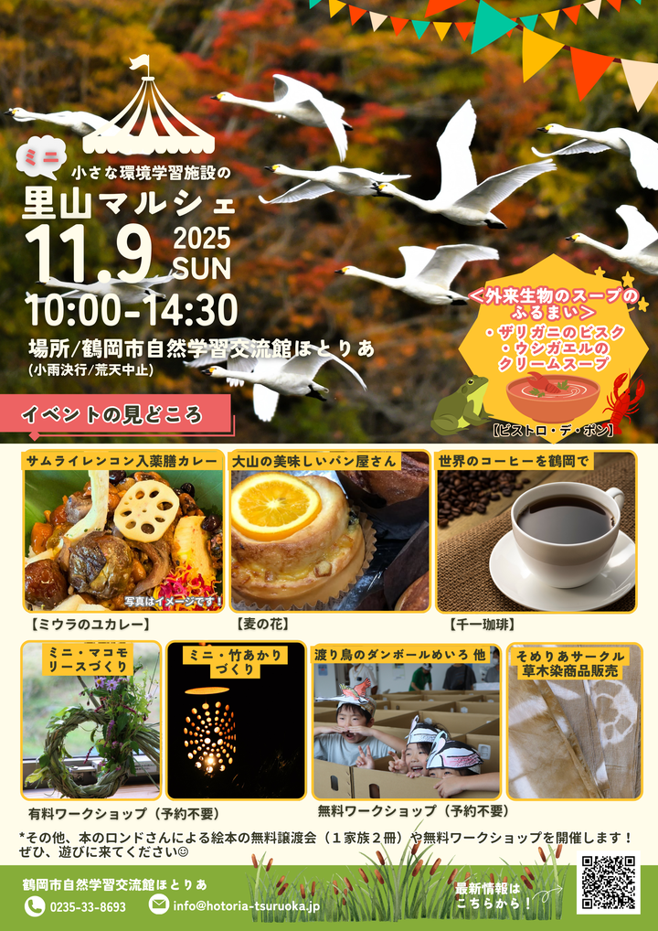 2025年11月9日 本日、11月10日(月)は、鶴岡市自然学習交流館**「ほとりあ」で開催される「里山マルシェ」**に出店します。 おはようございます! 本日、11月10日(月)は、鶴岡市自然学習交流館**「ほとりあ」で開催される「里山マルシェ」**に出店します。 会場では、寒い日に嬉しいあったかラテを中心に、特別価格の商品をご用意しました! 特価コーヒー豆(通常1,000円のおまとめ珈琲を600円でご提供!)ドリップパック ぜひ「ほとりあ」へお越しください。皆さまのご来場をお待ちしております! 岡部千信 千一珈琲の店主