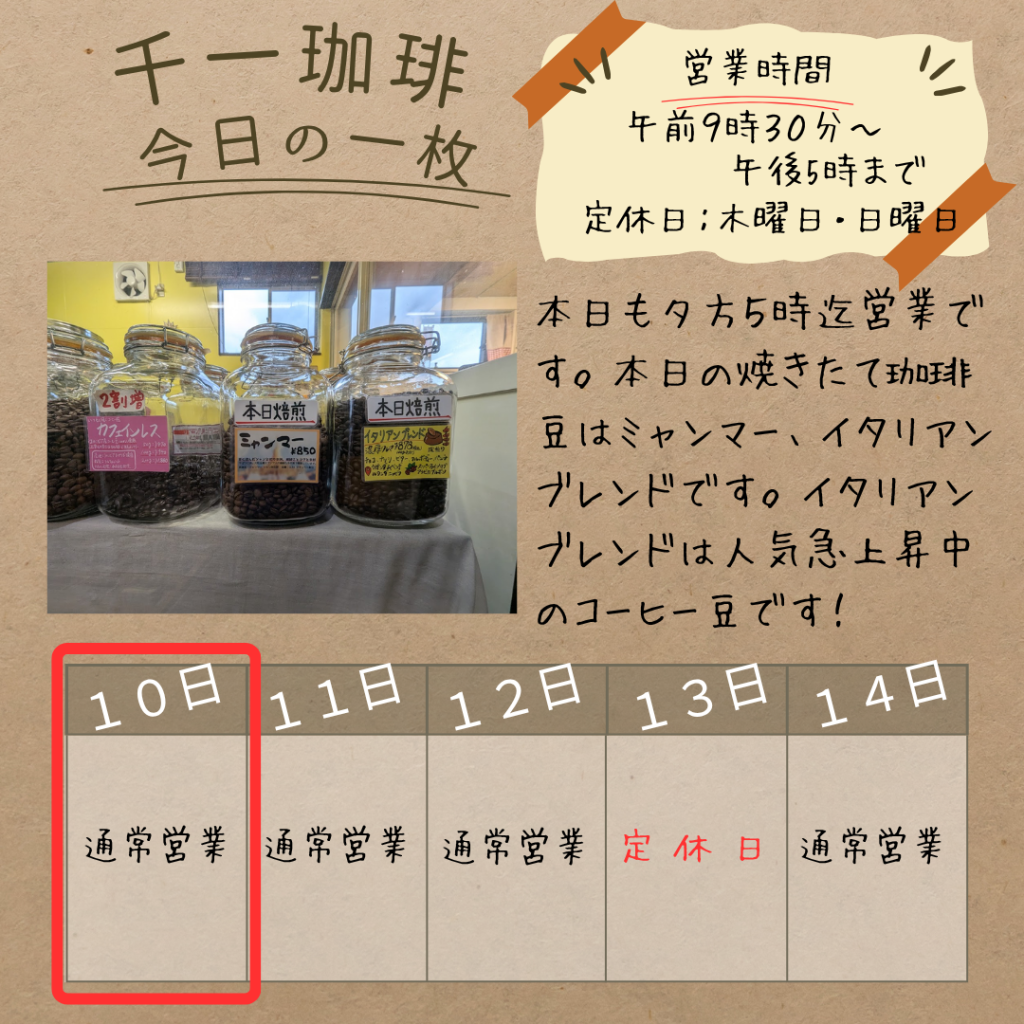 2025年11月10日 今日の焼きたて👇ミャンマー&イタリアンブレンド おはようございます! 本日も夕方5時まで営業しています。 今日の焼きたて珈琲は、 ミャンマーイタリアンブレンド の2種類です。 イタリアンブレンドは、そのコクと深みが寒くなってきた11月にぴったりで、現在赤丸急上昇中の人気を誇っています。 また、数量限定のお買い得コーヒー豆としてカフェインレスコーヒーをご用意しています。こちらも午後のティータイムにぴったりの優しい味わいです。 ぜひご来店ください! 岡部千信 千一珈琲の店主