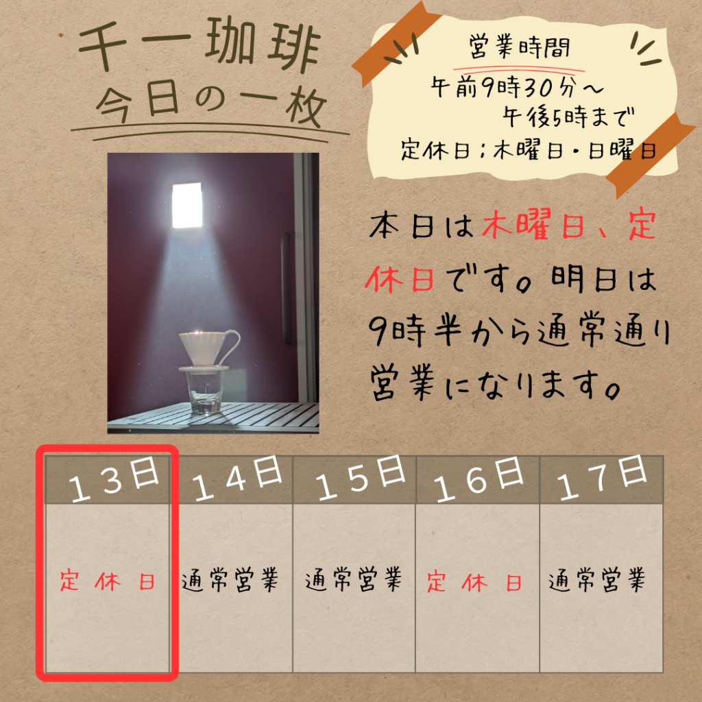 2025年11月13日 本日、11月13日(木)は定休日 おはようございます! 千一珈琲です。本日、11月13日(木)は定休日をいただいております。ご不便をおかけしますが、どうぞよろしくお願いいたします。 【明日のお知らせ】 明日、11月14日(金)は朝9時半から通常通り営業いたします。 岡部千信 千一珈琲の店主