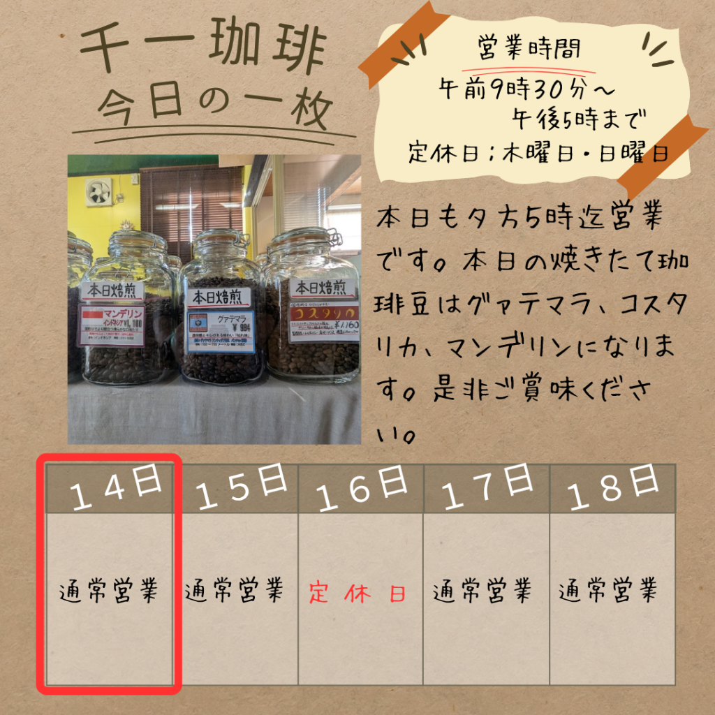 2025年11月14日 今日の焼きたて珈琲豆は、人気の3種類をご用意しました! おはようございます! 本日も夕方5時まで営業しています。 今日の焼きたて珈琲豆は、人気の3種類をご用意しました! グアテマラコスタリカマンデリン 中米からアジアまで、それぞれの土地の個性が光るコーヒーです。ぜひ飲み比べてご賞味ください。 岡部千信 千一珈琲の店主