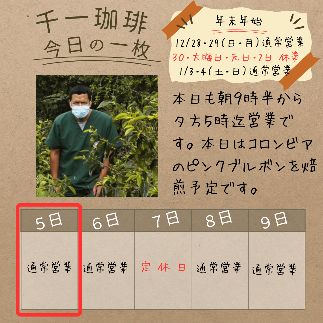 2025年12月5日 ☀️ 本日、12/5(金)も9:30〜17:00営業です! 今日はいよいよコロンビア #ピンクブルボンを焙煎します🇨🇴🔥 おはようございます! 本日も朝9時半から夕方5時まで営業しています。 本日ご紹介するのは、いよいよ焙煎予定のコロンビアのピンクブルボンです! 輸入元様からは、「白桃やオレンジ、アプリコットなど繊細な華やかさが魅力的。蜂蜜のような甘さも心地よく、清涼感・透明感のある綺麗なコーヒー」というコメントをいただいています。 このデリケートな特性を活かすため、当店では珍しい中煎りで様子を見て焙煎する予定です。 華やかでウェルバランスなこのロットを、ぜひお楽しみください! 岡部千信 千一珈琲の店主