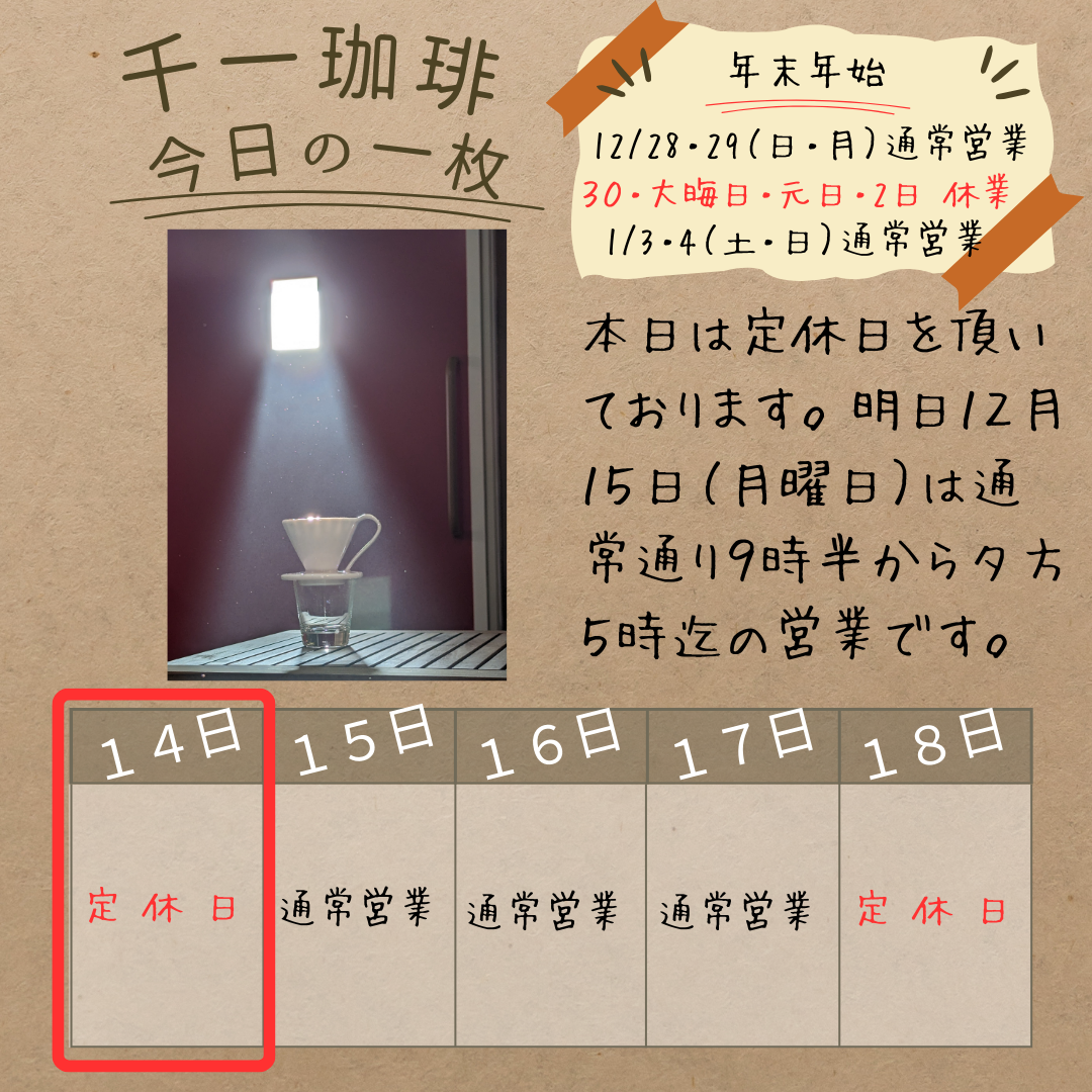 2025年12月14日 ☕️ 本日12/14(日)は定休日です🙏 おはようございます! 千一珈琲です。本日、12月14日(日)は定休日をいただいております。ご不便をおかけしますが、どうぞよろしくお願いいたします。 【明日のお知らせ】 明日、12月15日(月)は通常通り朝9時半から夕方5時まで営業いたします。 岡部千信 千一珈琲の店主