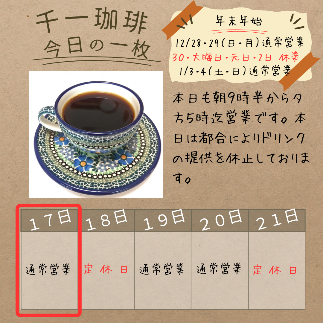 2025年12月17日 ☀️ 本日12/17(水)も9:30〜17:00営業です。 【お知らせ】 本日は都合により、ドリンクの提供をお休みさせていただきます🙇♂️ おはようございます! 本日も朝9時半から夕方5時まで営業しています。 【ドリンク提供休止のお知らせ】 誠に勝手ながら、本日は都合によりドリンクの提供(テイクアウト等)を休止させていただきます。 コーヒー豆の販売は通常通り行っております。 ご不便をおかけいたしますが、何卒ご理解のほどよろしくお願いいたします。 岡部千信 千一珈琲の店主