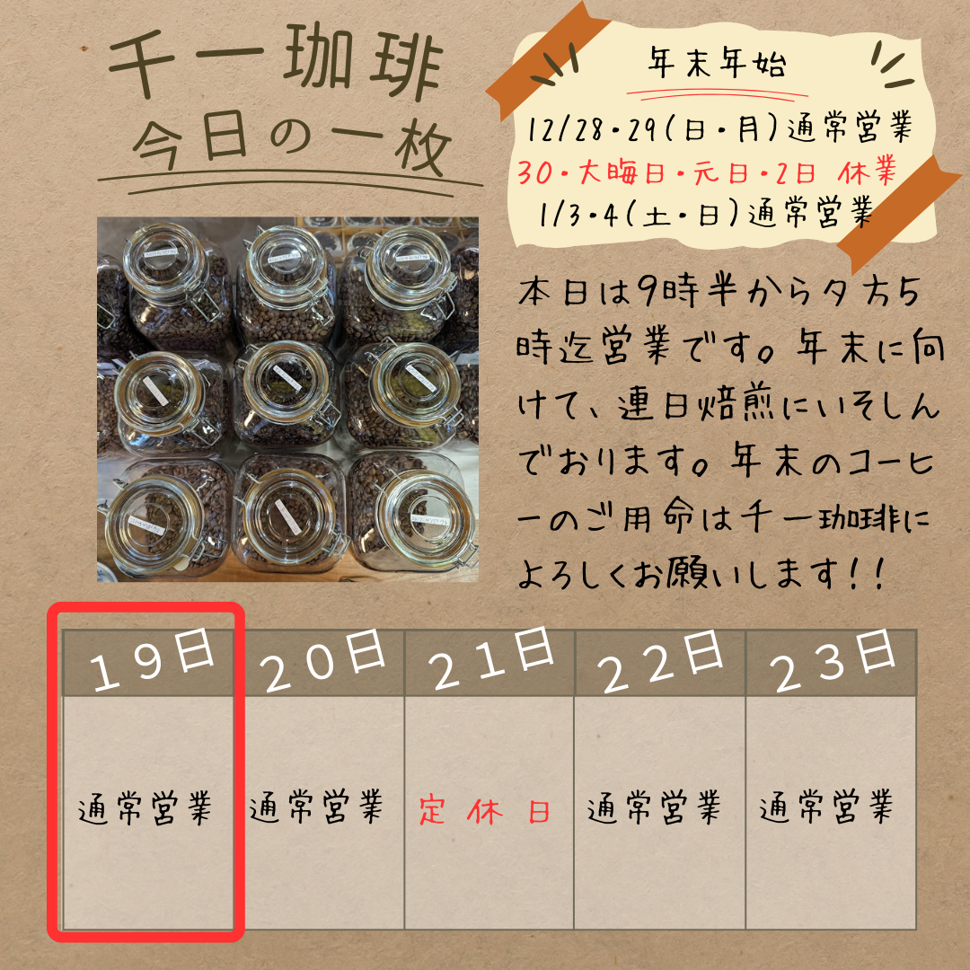 2025年12月19日 ☀️ 本日、12/19(金)も9:30〜17:00営業です! 年末に向けて、連日気合を入れて焙煎にいそしんでおります🔥☕️ おはようございます! 本日も朝9時半から夕方5時まで営業しております。 年末を控え、皆様のコーヒータイムが豊かなものになるよう、連日焙煎にいそしんでおります! お掃除や帰省の準備など、忙しい時期の合間にホッと一息つくコーヒー、または大切な方への贈り物など、年末のコーヒーのご用命はぜひ千一珈琲にお任せください!! 岡部千信 千一珈琲の店主