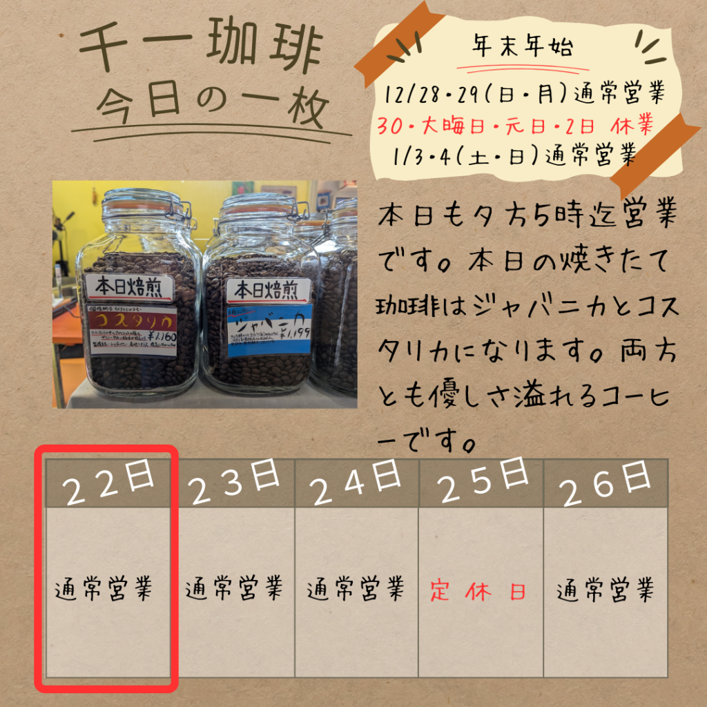2025年12月22日 ☀️ 本日12/23(火)も17時まで営業です! 今日の焼きたてはニカラグア ジャバニカ&コスタリカ ハニー☕️✨ おはようございます! 本日も夕方5時まで営業しております。 本日の焼きたてコーヒーは、中米の魅力を存分に味わえる2銘柄をご用意しました。 ニカラグア ジャバニカコスタリカ ハニーコーヒー どちらも中米らしい、柔らかく優しい味わいが特徴のコーヒーです。 慌ただしい年末のひとときに、心温まる優しい一杯はいかがでしょうか。ぜひこの機会にお試しください! 岡部千信 千一珈琲の店主