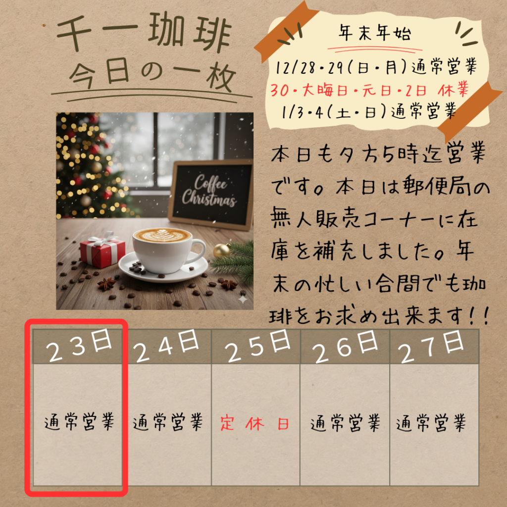 2025年12月23日 ☀️ 本日12/24(水)も17時まで営業中です おはようございます! 本日も夕方5時まで営業しております。 【郵便局の無人販売コーナー 補充完了!】 本日、郵便局の無人販売コーナーにコーヒー豆の在庫を補充してきました。 年末の慌ただしい時期、お店に寄る時間がなかなか取れないという方も、郵便局でのついでにお気軽にお買い求めいただけます。忙しい合間のリフレッシュに、ぜひ千一珈琲をご活用ください!! 岡部千信 千一珈琲の店主