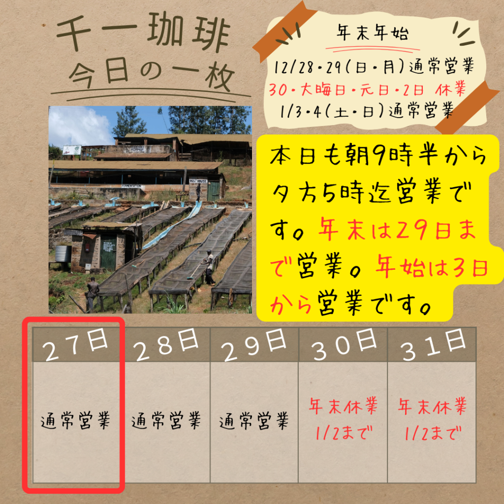 2025年12月27日 ❄️ 本日12/27(土)も17時まで営業です! おはようございます! 本日も夕方5時まで営業しております。 ついに雪が降り始めましたね。景色が白くなると、いっそう「年末」という感じが強まってきます。 足元は悪くなりますが、寒さに負けず元気に頑張って営業しております! 年内は29日(月)まで休まず営業しますので、お正月のコーヒー豆の準備や、温かいコーヒーでの休憩にぜひお立ち寄りください。 岡部千信 千一珈琲の店主