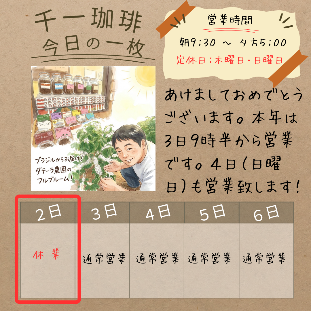 2026年1月2日 🎍あけましておめでとうございます🎍 本年も皆様に素敵なコーヒーライフをお届けできるよう頑張ります! 新年あけましておめでとうございます。 本年も、皆様に素敵なコーヒーライフをお届けできるよう、精一杯頑張ってまいります。 お店の営業は明日1月3日(土)からとなりますが、本日からお店の準備をスタートしました! 明日の初売りに向けて、新鮮で香り高い豆をご用意できるよう、気合を入れて焙煎します🔥 2026年も、千一珈琲の一杯が皆様の癒しとなりますように。 本年もどうぞよろしくお願い申し上げます。 岡部千信 千一珈琲の店主