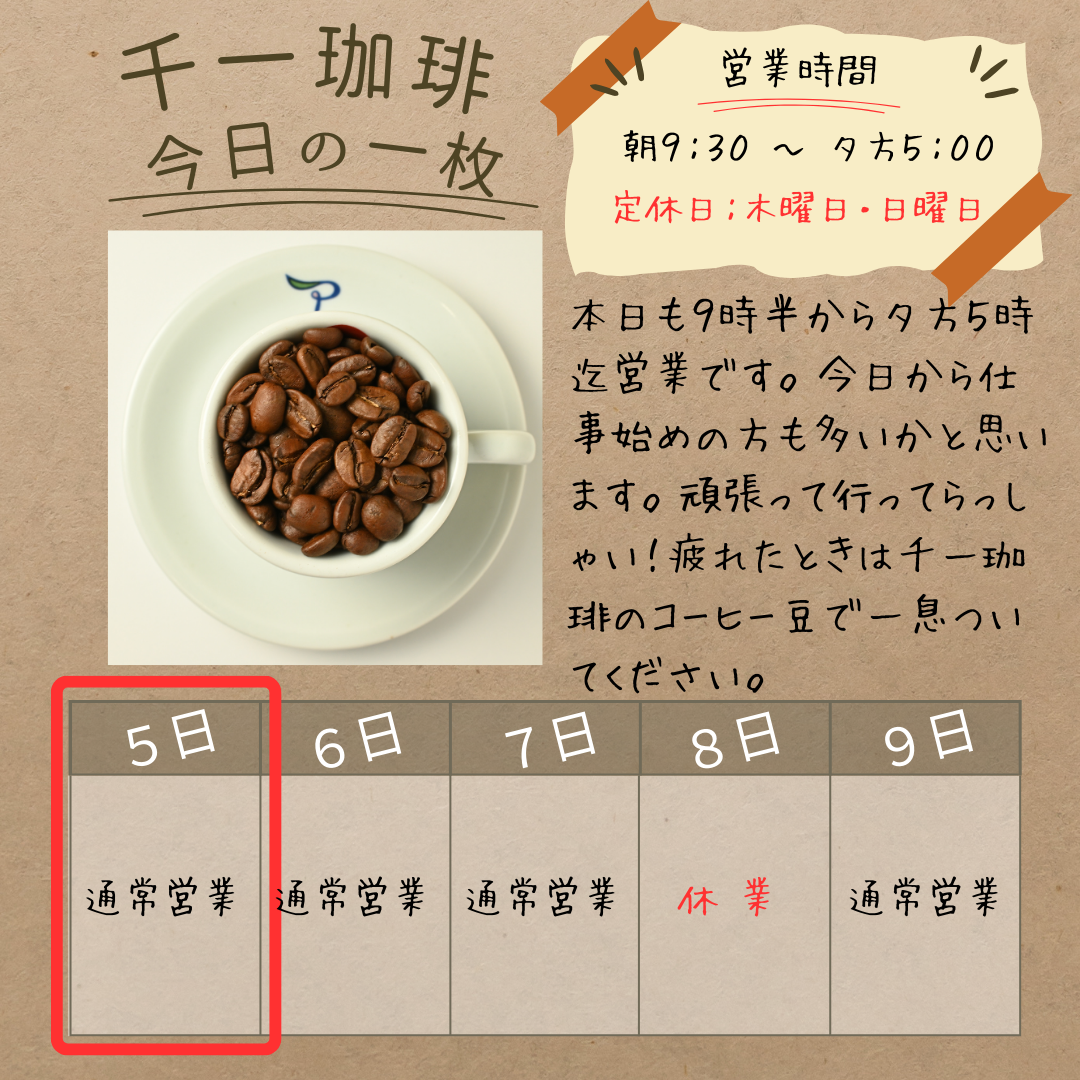 2026年1月5日 ☀️ 本日1/5(月)も17時まで営業です。 「仕事始め」行ってらっしゃい 🚗💨 おはようございます! 本日も朝9時半から夕方5時まで営業しております。 今日から「仕事始め」という方も多いのではないでしょうか? 長いお休み明け、生活リズムを戻すのが大変かもしれませんが、無理せず頑張ってくださいね。 皆様、「行ってらっしゃい!」 もし仕事で疲れたなと感じたら、千一珈琲のコーヒー豆でほっと一息ついてください。 皆様の日常への復帰を、美味しいコーヒーで応援しております。 岡部千信 千一珈琲の店主