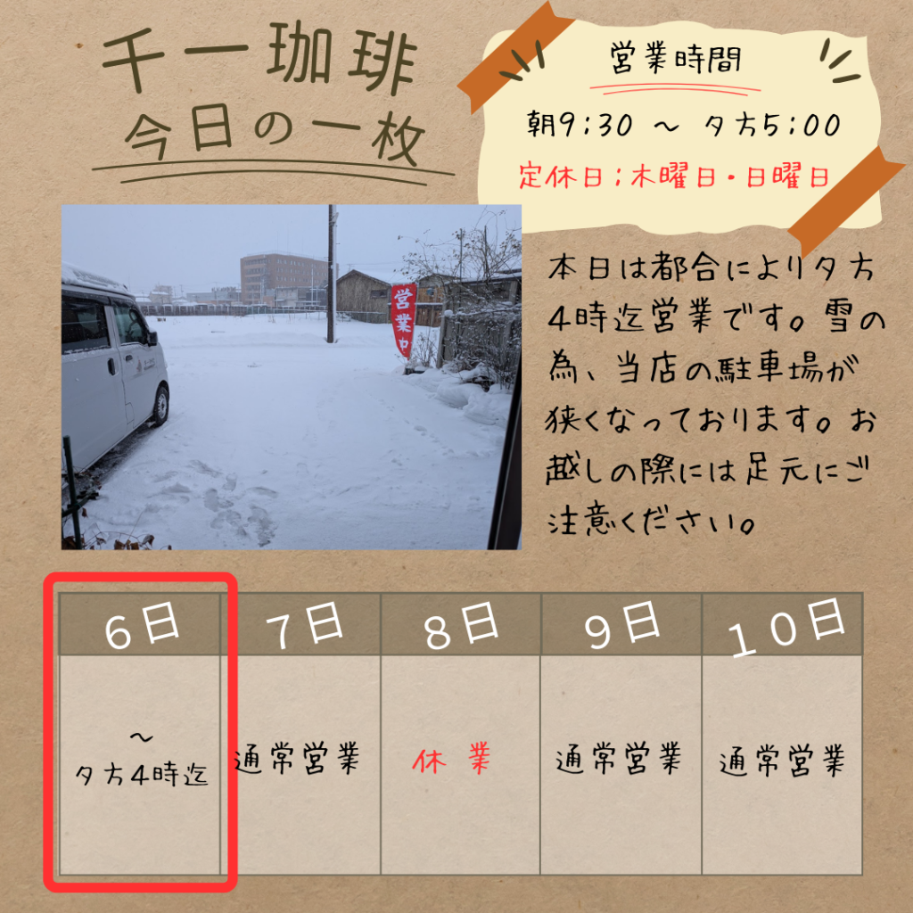 2026年1月6日 【営業時間変更のお知らせ】 本日1/6(火)は、都合により16:00閉店とさせていただきます🙇♂️ おはようございます。 本日は都合により、夕方4時までの営業とさせていただきます。 (急な変更となり、大変申し訳ございません。) また、降り続く雪の影響で、現在当店の駐車場が通常より狭くなっております。 お車でお越しのお客様は、駐車の際に十分ご注意ください。また、入り口付近も滑りやすくなっておりますので、足元にお気をつけてお入りください。 短縮営業となりますが、4時までは温かいコーヒーをご用意してお待ちしております。 岡部千信 千一珈琲の店主