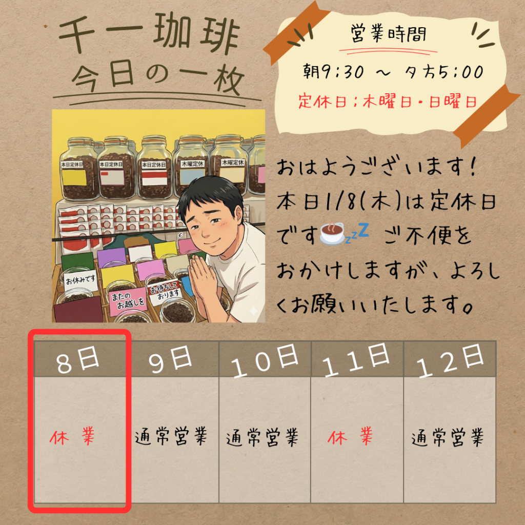 2026年1月8日 本日1/8(木)は定休日です☕️💤 おはようございます。 本日は定休日となっております。 ご来店を予定されていたお客様には申し訳ございませんが、また明日以降のお越しを心よりお待ちしております。 明日1月9日(金)は、通常通り朝9時半から夕方5時まで営業いたします。 しっかりとリフレッシュして、また明日から美味しいコーヒーをご用意してお待ちしております! 岡部千信 千一珈琲の店主