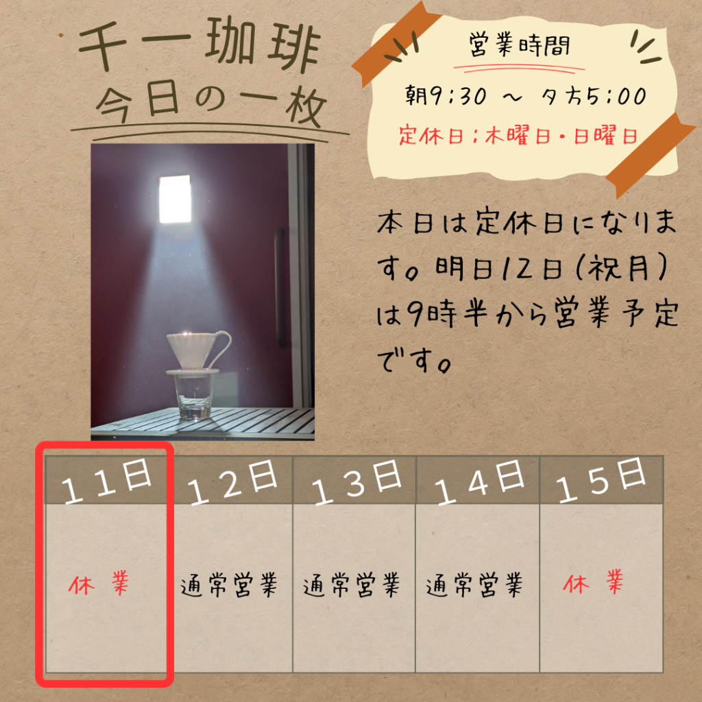 2026年1月11日 本日1/11(日)は定休日でお休みです💤 おはようございます。 誠に勝手ながら、本日は定休日とさせていただきます。 3連休の中日、ご来店を予定されていたお客様には大変申し訳ございませんが、何卒ご了承くださいませ。 **明日1月12日(月・祝)**は、朝9時半から営業する予定です! 成人の日の祝日、皆様の休日のひとときに美味しいコーヒーをご用意してお待ちしております。 どうぞ素敵な日曜日をお過ごしください。 また明日、皆様にお会いできるのを楽しみにしております。 岡部千信 千一珈琲の店主