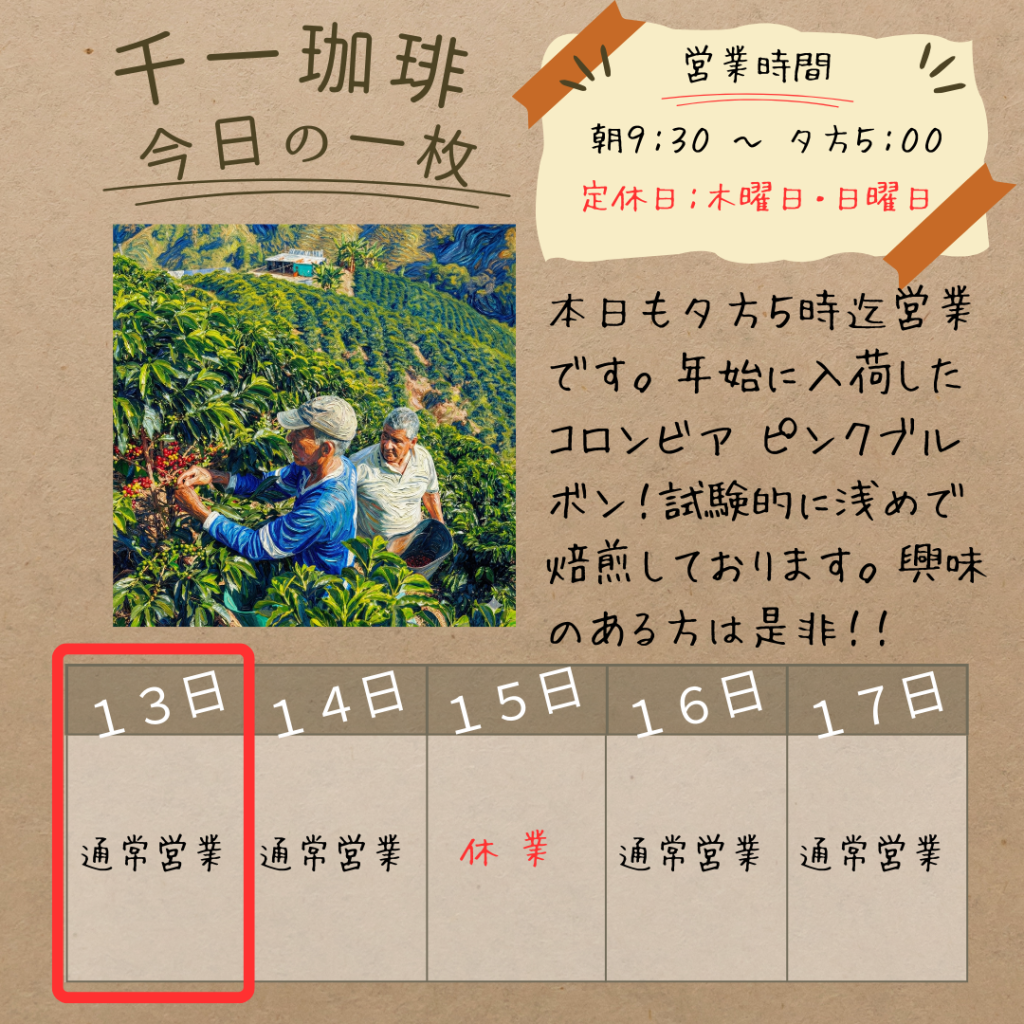 2026年1月13日 本日も17時まで営業中☕️ 1/13(火)おはようございます!本日も17時まで営業中☕️ 【⚡️緊急告知⚡️】 年始入荷の希少種「🇨🇴コロンビア ピンクブルボン」。 今回、マスターの気まぐれ(!?)で、試験的に「浅煎り」で仕上げてみました!🔥 今だけの特別な味わいです。 興味のある方!ぜひお試しを!✨ 岡部千信 千一珈琲の店主