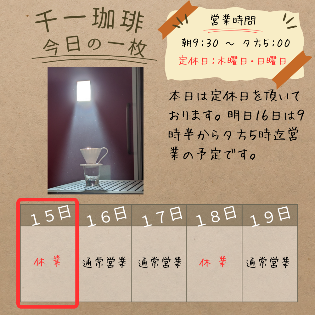 2026年1月15日 本日は定休日を頂いております。明日16日は9時半から夕方5時迄営業の予定です。 本日は定休日を頂いております。明日16日は9時半から夕方5時迄営業の予定です。 岡部千信 千一珈琲の店主